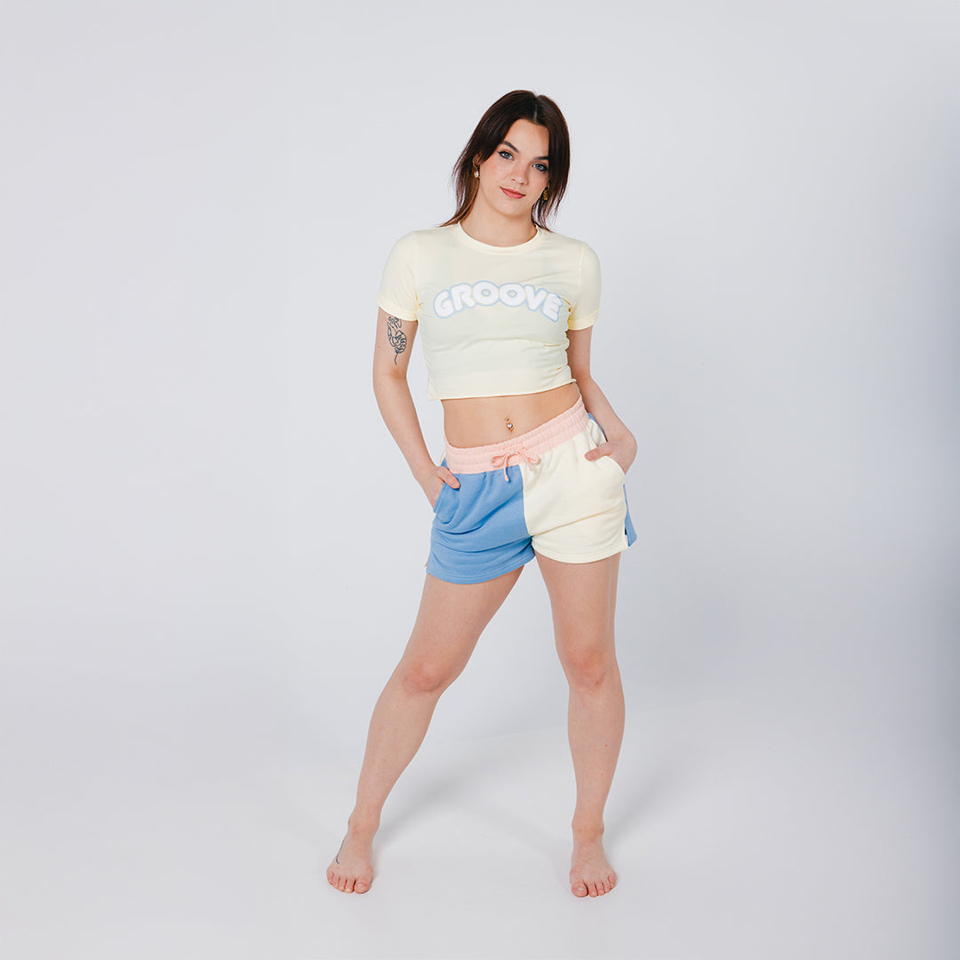 Brighten up your casual wardrobe with these trendy color block shorts! Featuring a unique blend of pastel hues, these shorts radiate fun and laid-back vibes. The soft elastic waistband and adjustable drawstring ensures the perfect fit for all day comfort. With a stylist patch pocket in the back, adorned with a GR logo, these shorts combine practicality and style.